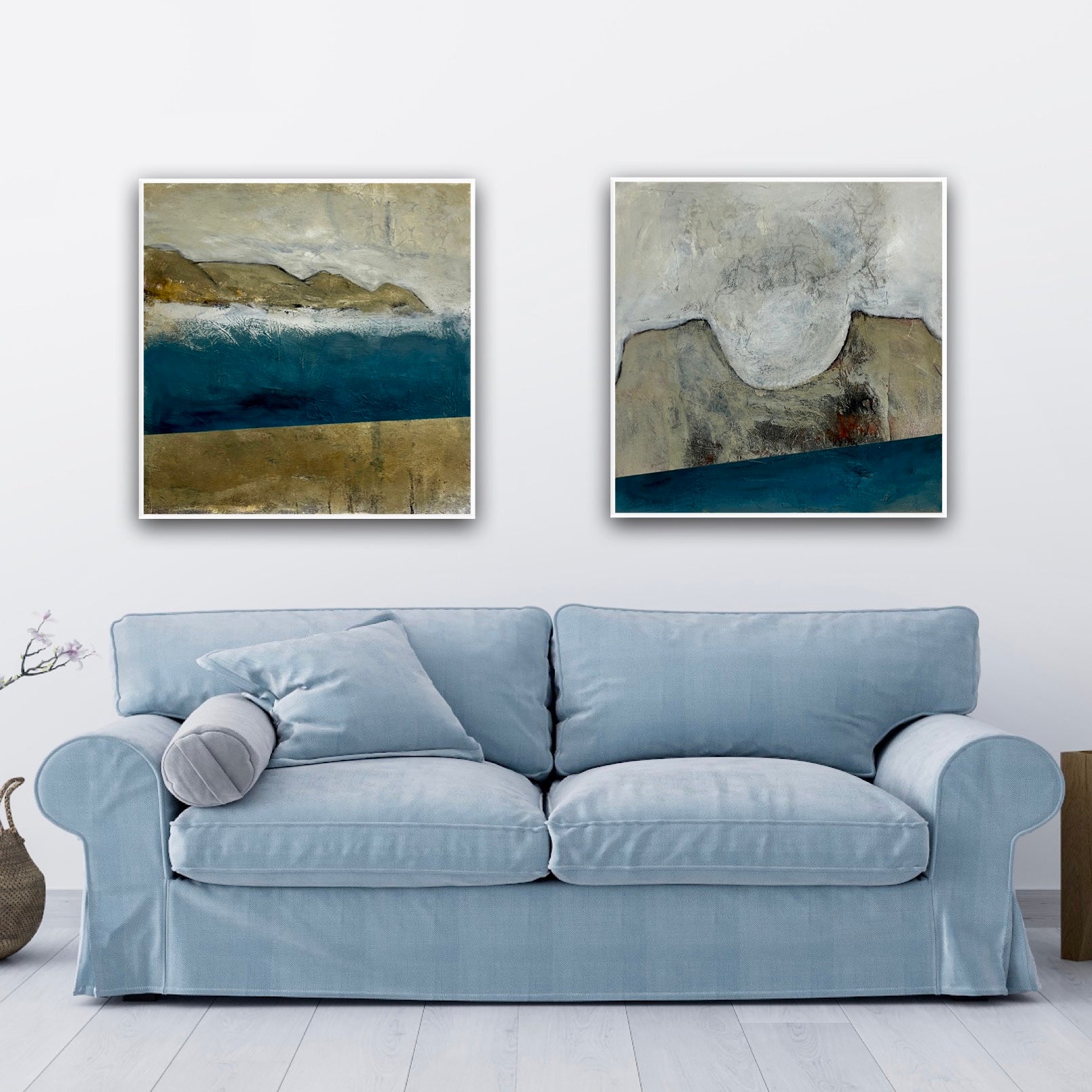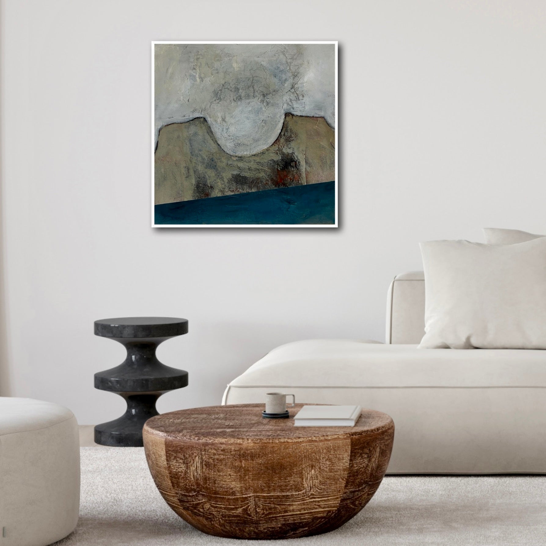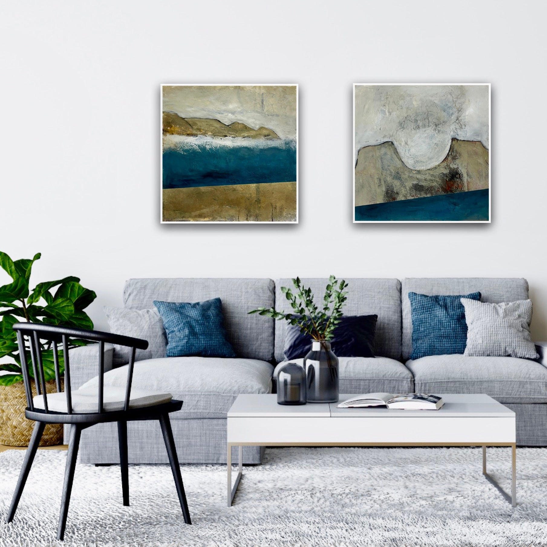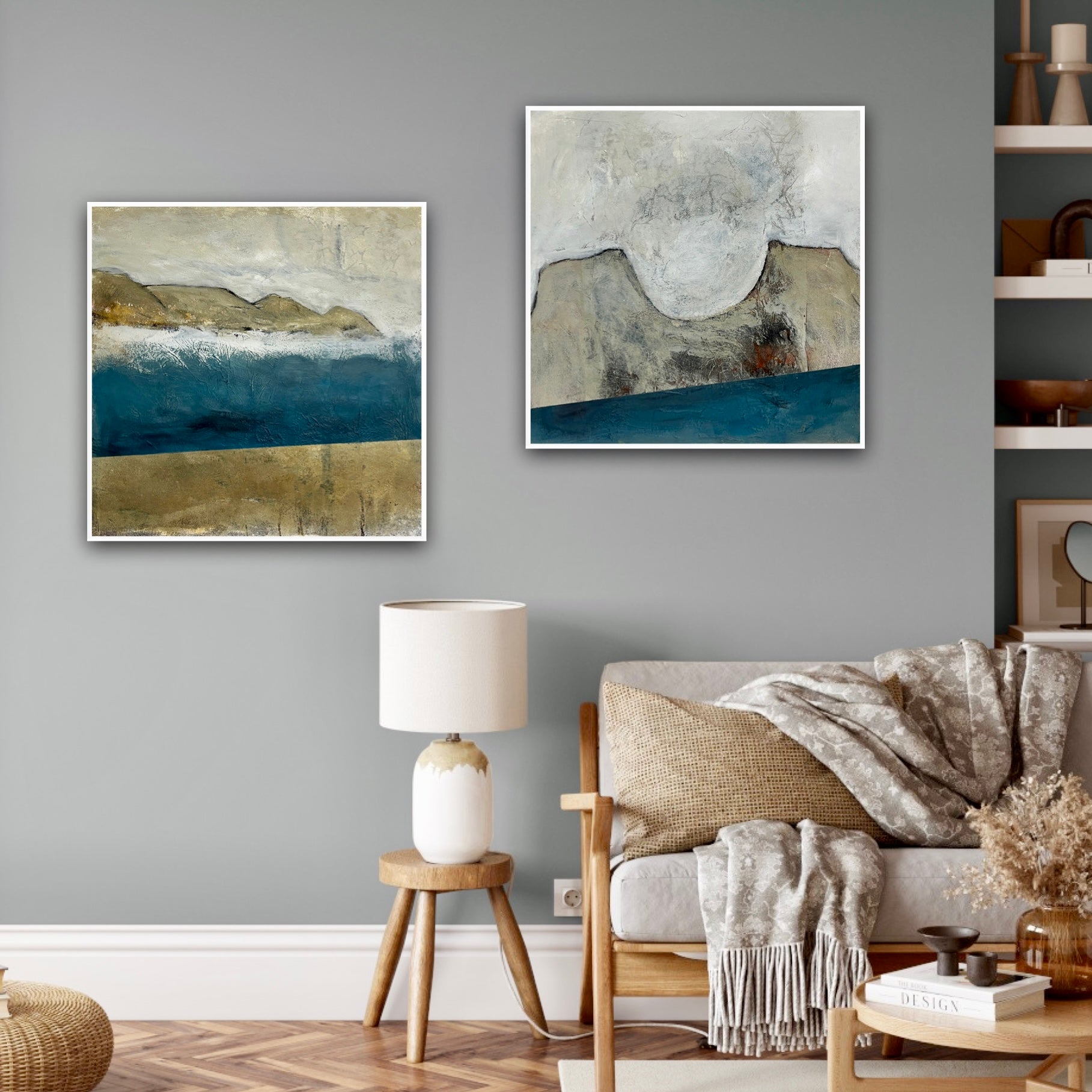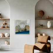The painting is 60cm by 60cm and is supplied in an off-white float frame with fixings for wall hanging.