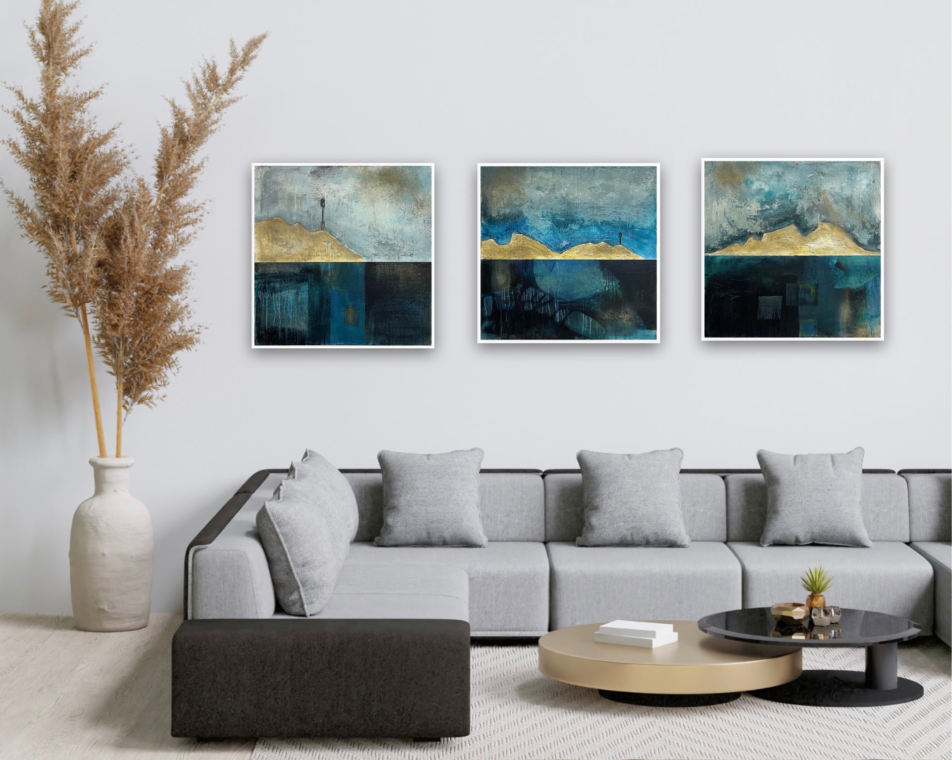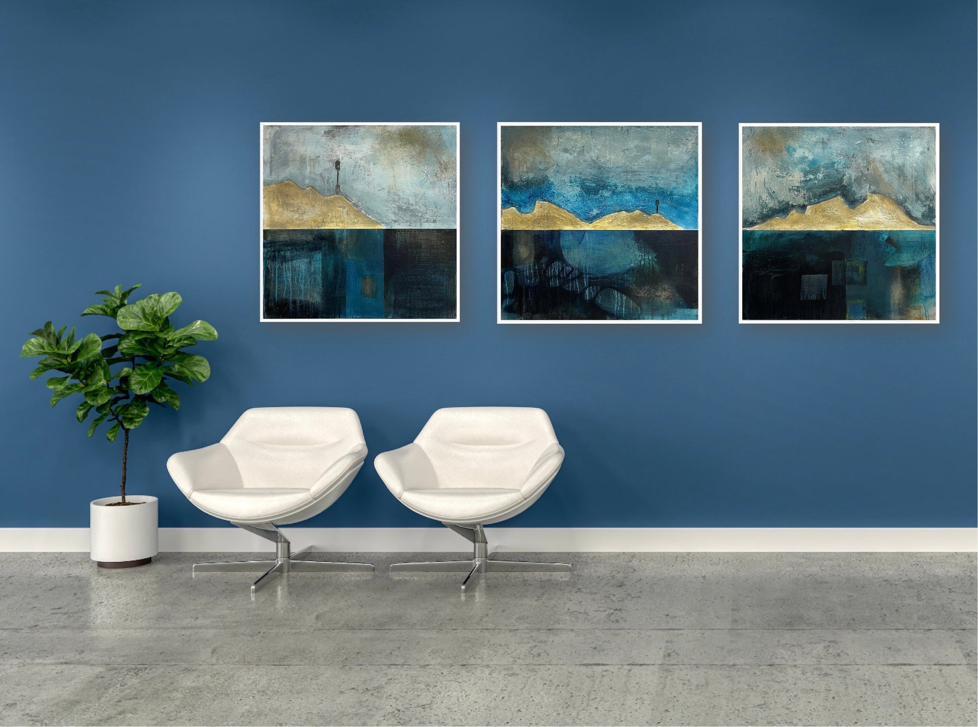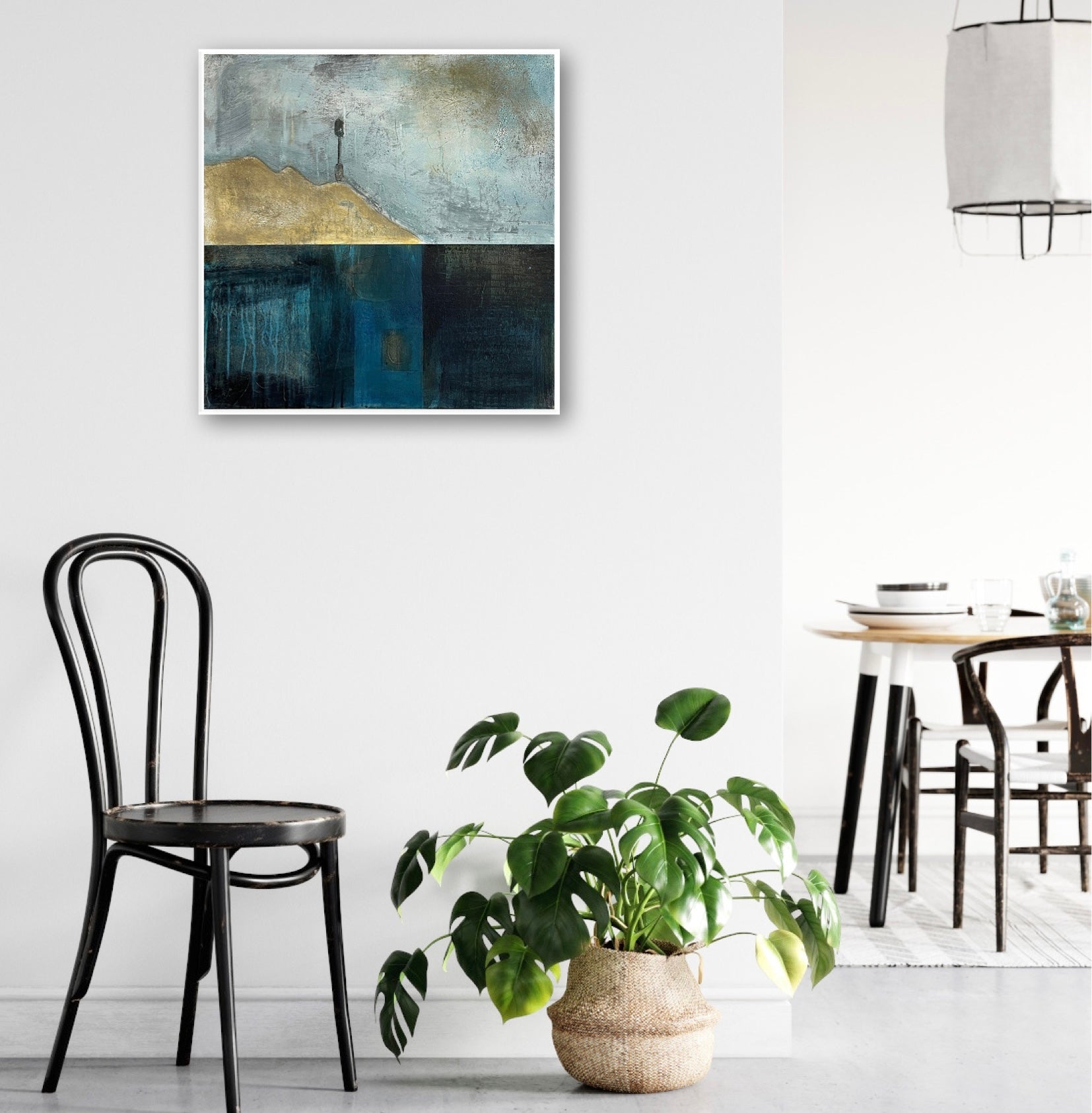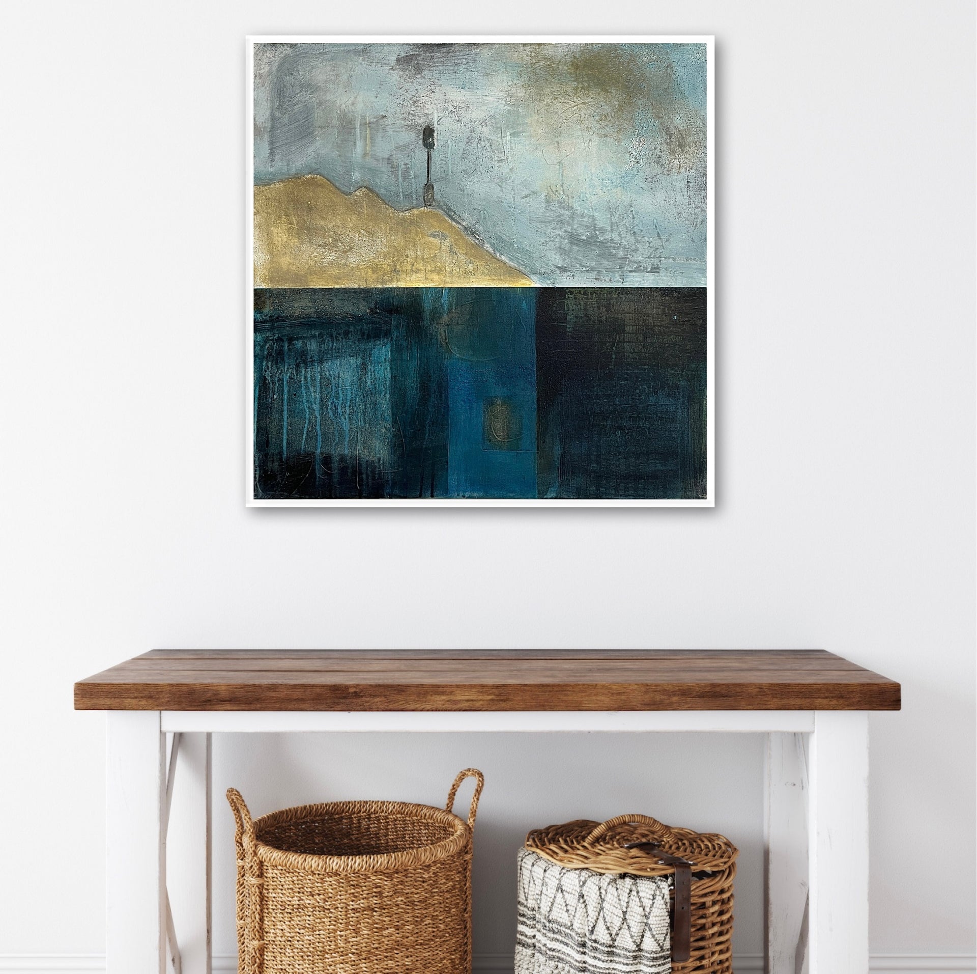 The painting is 60cm by 60cm and is supplied in an off-white float frame with fixings for wall hanging.