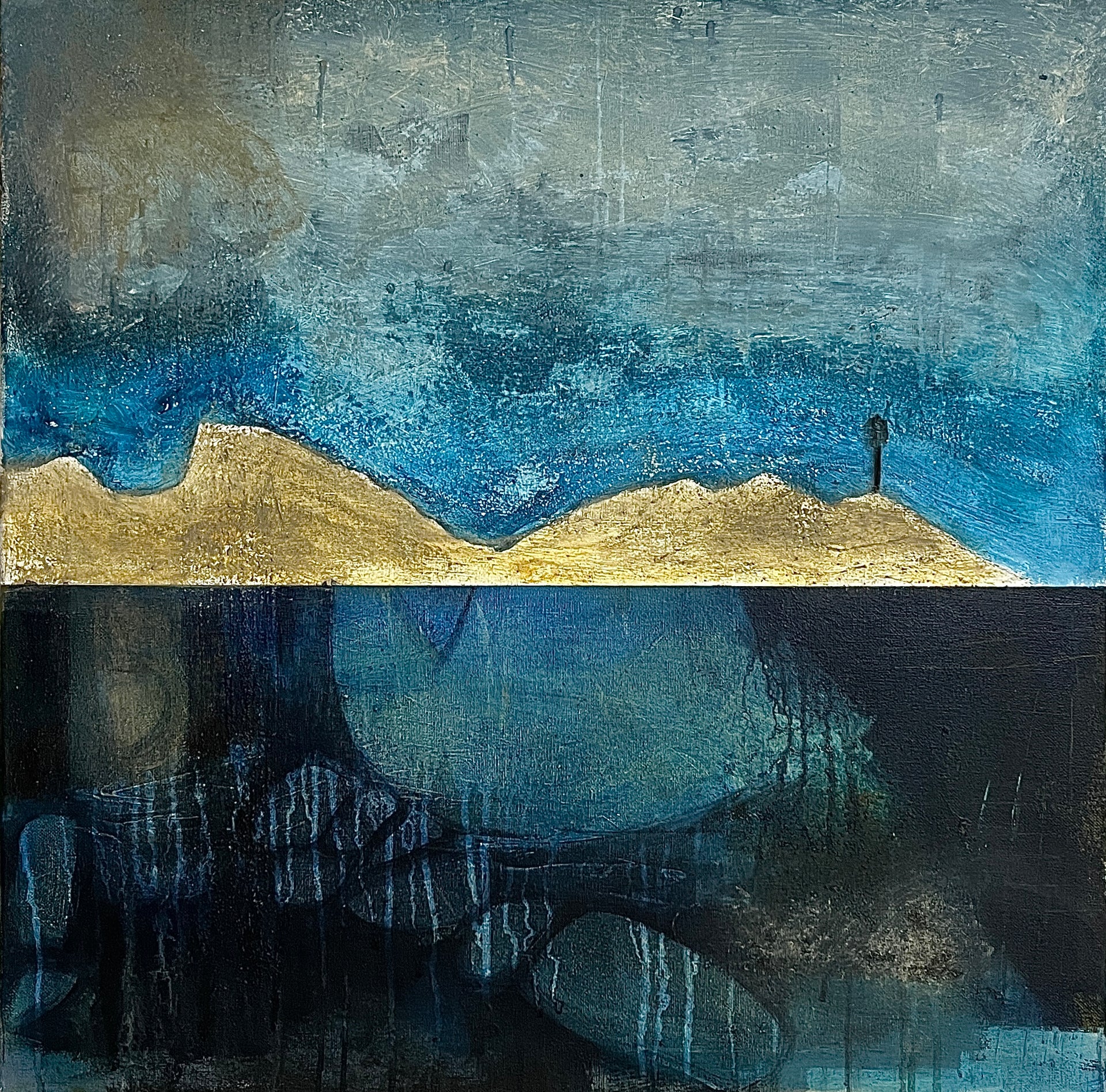 'Maritime Guardian' reflects the dual nature of our coastal defences - both above and below the waterline. The rich earth pigments, collected from nearby cliffs, create a dialogue with the deep blue waters and embody the meeting point of land and sea.