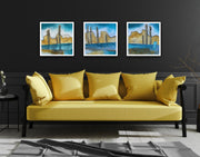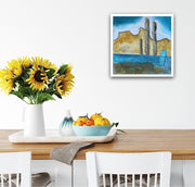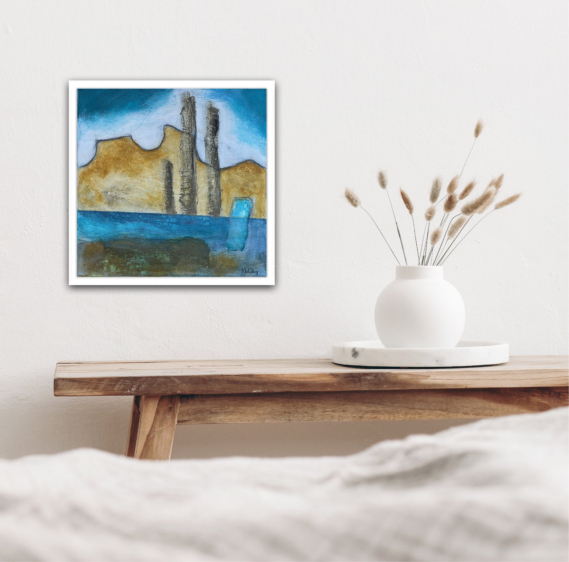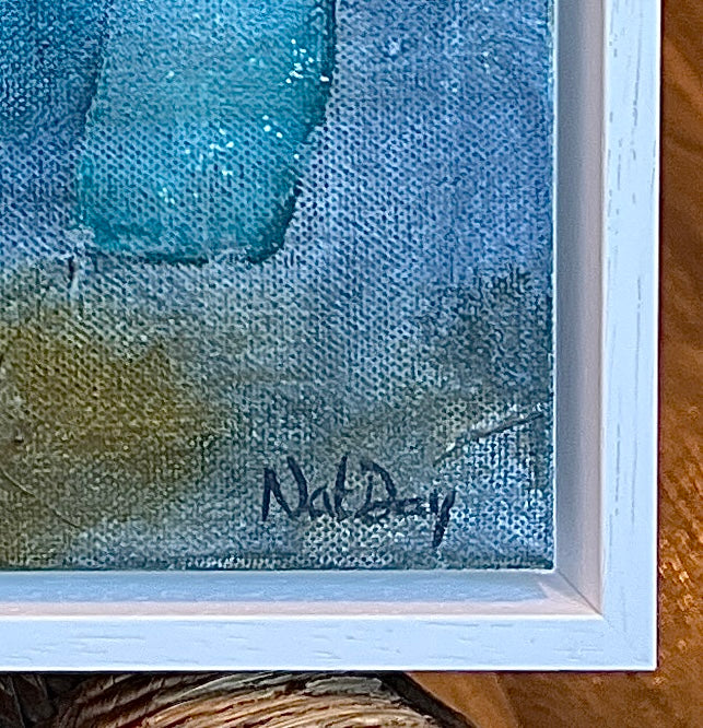 The painting is 40cm by 40cm and is supplied in an off-white float frame with fixings for wall hanging.