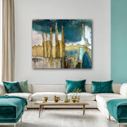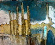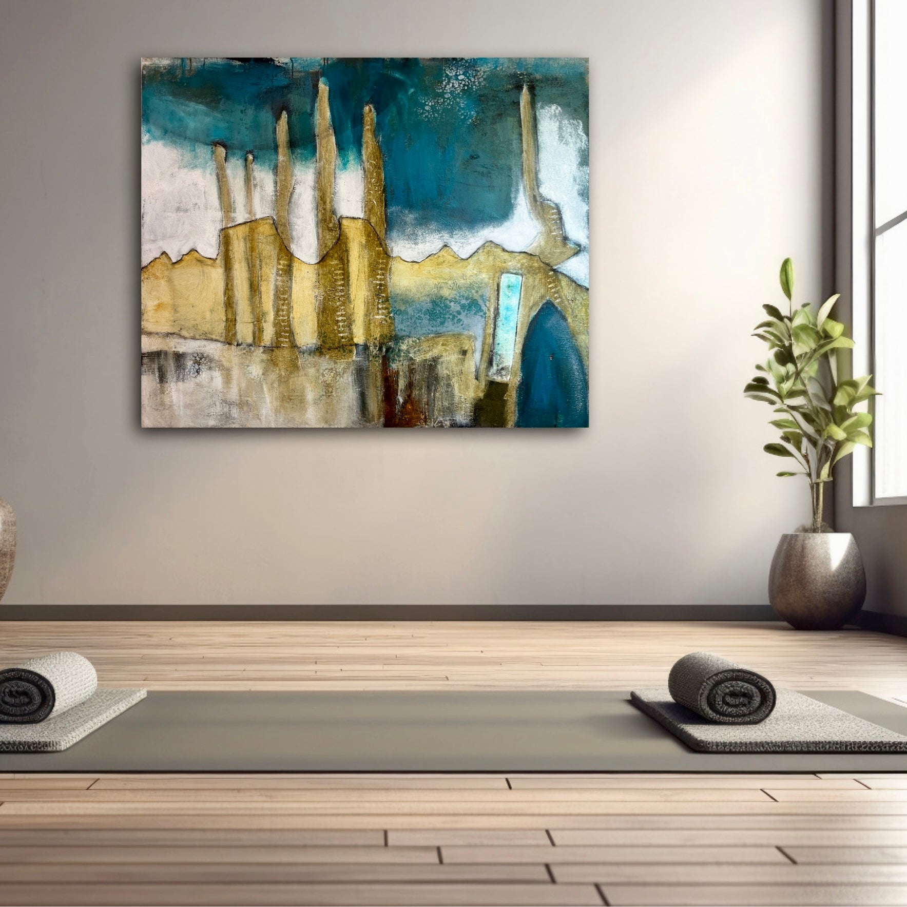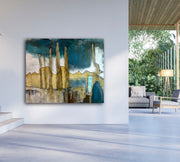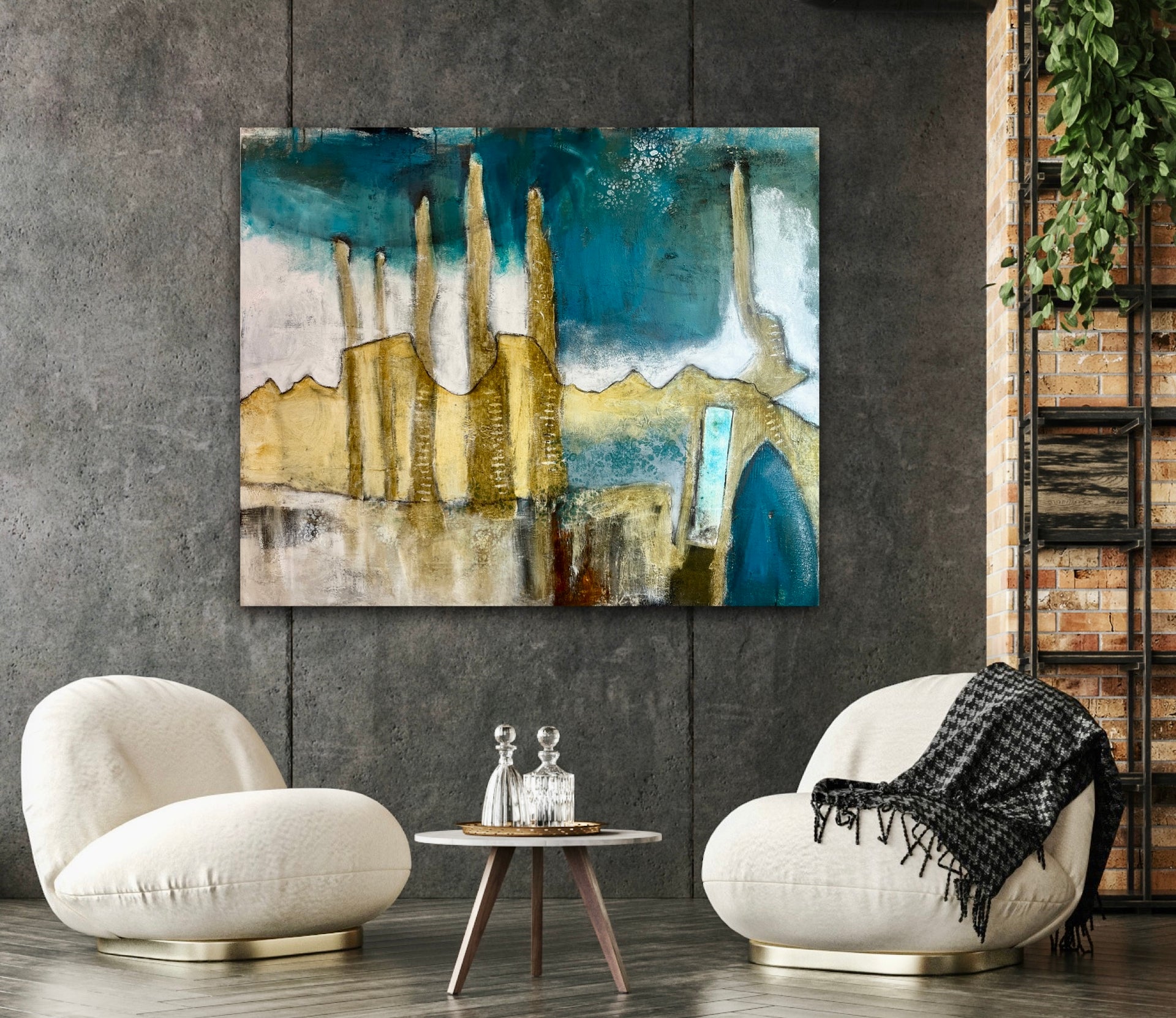 The painting is 120cm wide and 100cm tall and is supplied with fixings for wall hanging and off-white painted deep edges.