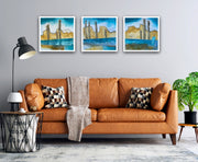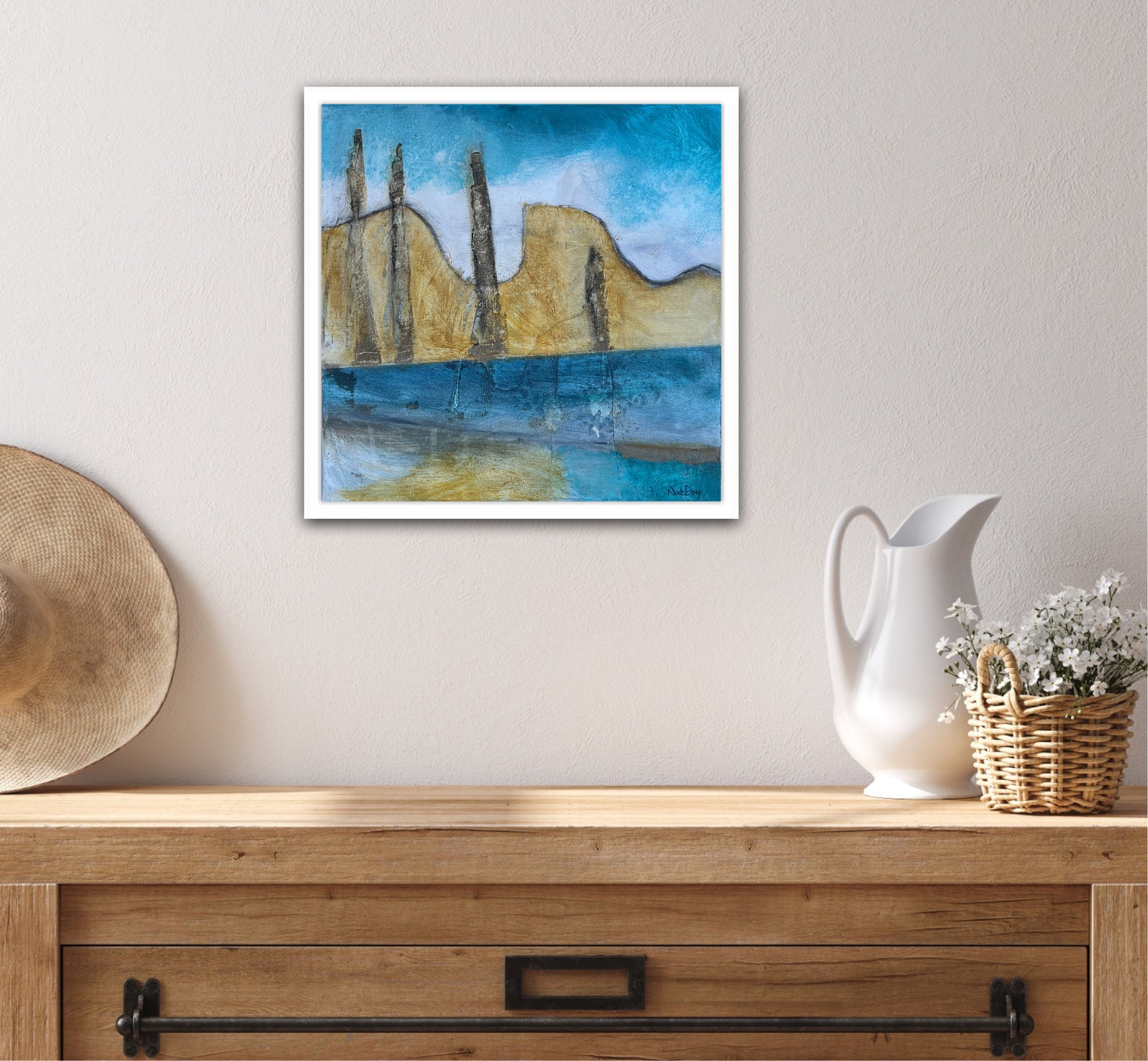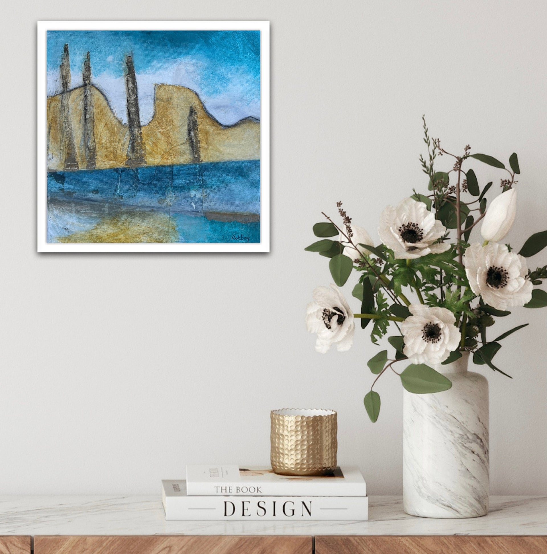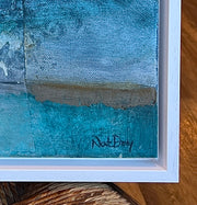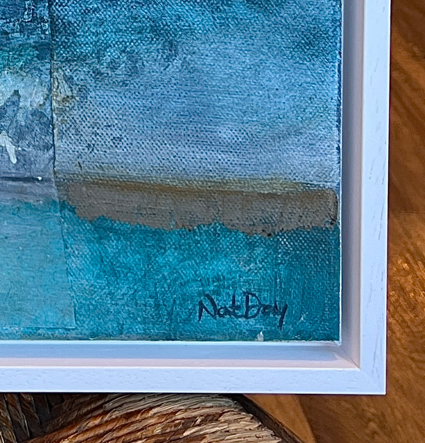 The painting is 40cm by 40cm and is supplied in an off-white float frame with fixings for wall hanging.