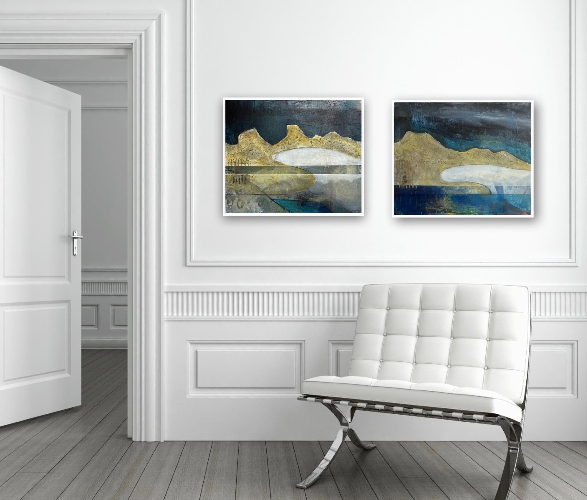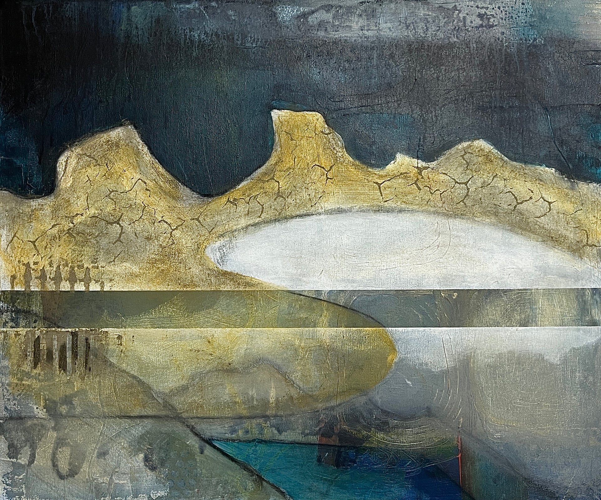 'Timeless Thresholds' celebrates the meeting of north Cornwall's ancient geological shores and deep waters, layered by time, earth-shaping events and human history. Hand-processed earth pigments create textural landscapes that speak of geological time and the eternal dialogue of the coast.
