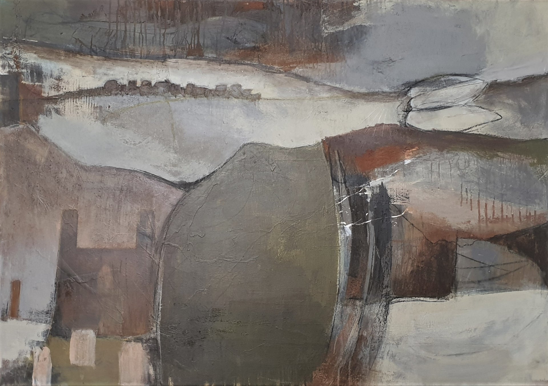 The natural material has been collected from the site on which the painting is based, processed by hand and left in a fairly coarse state to add texture. Paintings containing these natural materials literally have the land that inspired them infused into the artwork, bringing a real sense of the landscape into the work. They inform the choice of colour palette to ensure an authentic feel and connection to the subject.