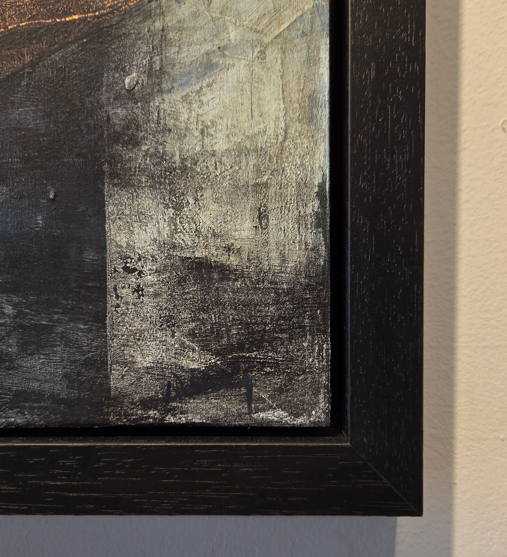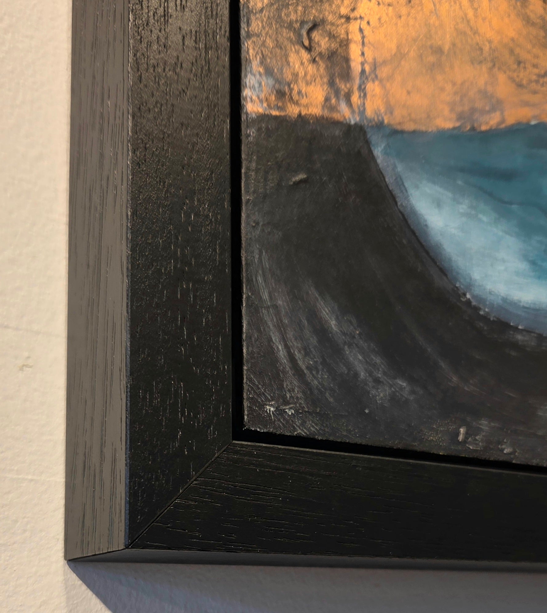 The painting is 38cm by 38cm and is supplied in a chunky black float frame with fixings for wall hanging.