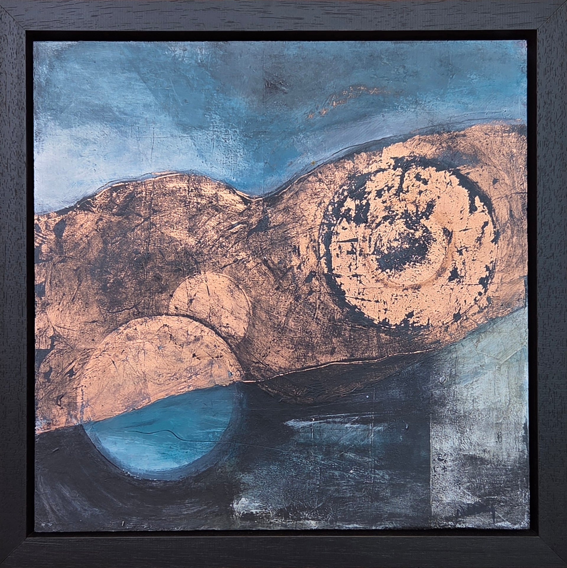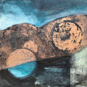 Ancient moorland reveals its secrets through layers of copper and earth, where circular forms echo the sacred geometry of Cornwall's stone circles and ritual sites. This powerful landscape piece captures the essence of Bodmin Moor's timeless terrain - weathered rock formations, mysterious circular markers, and the deep blue of moorland pools that reflect endless skies. The textured surface speaks of millennia passed, whilst copper leaf catches light like the last rays of sun illuminating ancient stones. A profound meditation on place, memory, and the sacred geometry that binds us to ancestral wisdom.