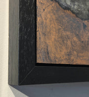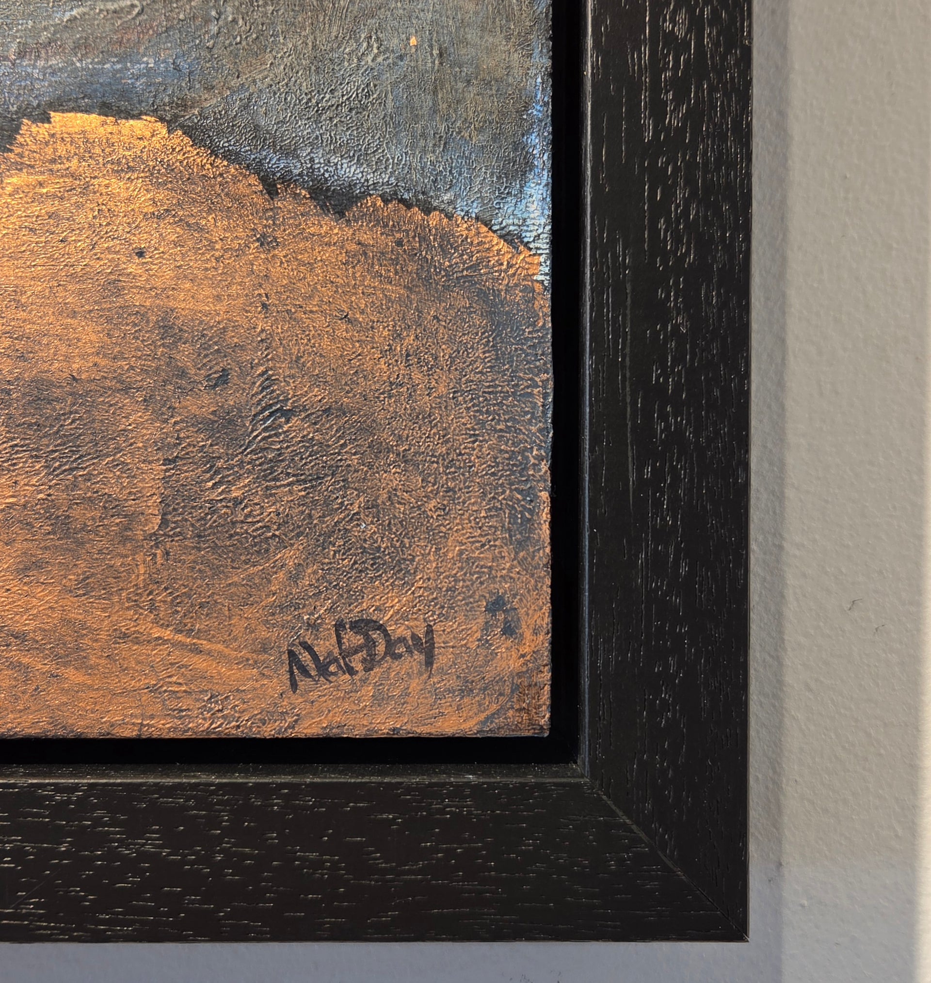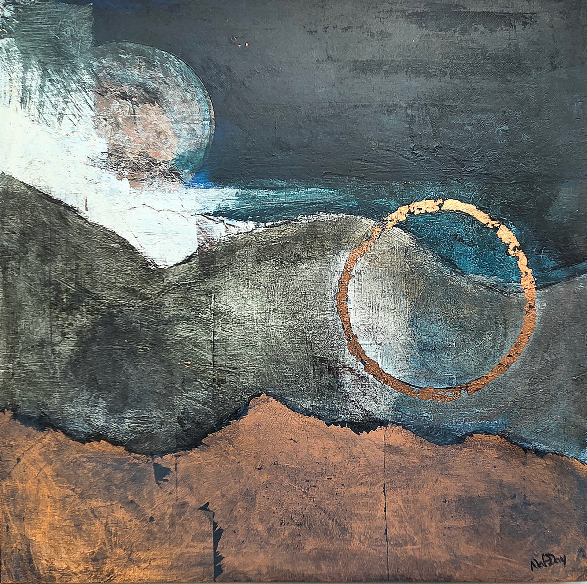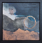 This atmospheric piece captures the liminal space between earth and sky, land and sea, present and past. Layers of earth pigments create a dramatic terrain of shadowed valleys and weathered cliffs, whilst ethereal blues suggest both coastal waters and infinite skies. The copper-leaf circle acts as a portal or lens, inviting contemplation of the timeless forces that shape our landscape - wind, water, geological time, and human presence stretching back millennia. A piece that speaks to the enduring power of place and our deep need to mark and honour the terrain that holds us.