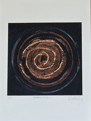 This intimate study explores the ancient symbolism of the spiral - representing growth, cosmic energy, and the eternal cycle of life. Rich copper leaf applied over the high quality scanned print catches and reflects light like captured sunlight, whilst deep blue passages evoke the mystery of night skies.