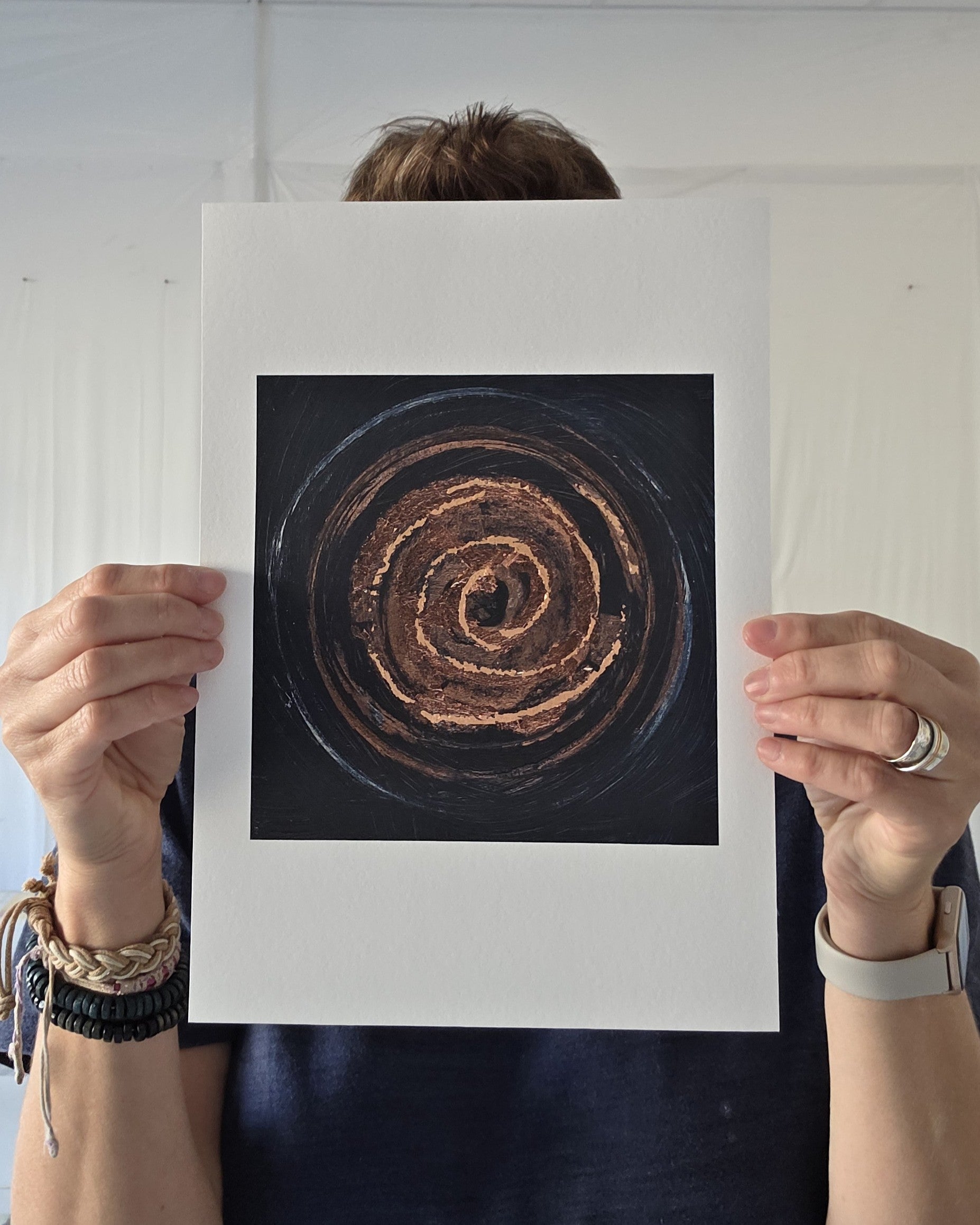 A beautiful limited edition hand embellished print of the original, featuring a mesmerising spiral of copper and midnight blue that draws the eye into its hypnotic centre.