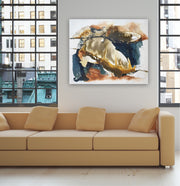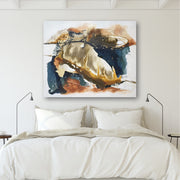 The painting is 120cm wide and 100cm tall and is supplied with fixings for wall hanging and off-white painted deep edges.