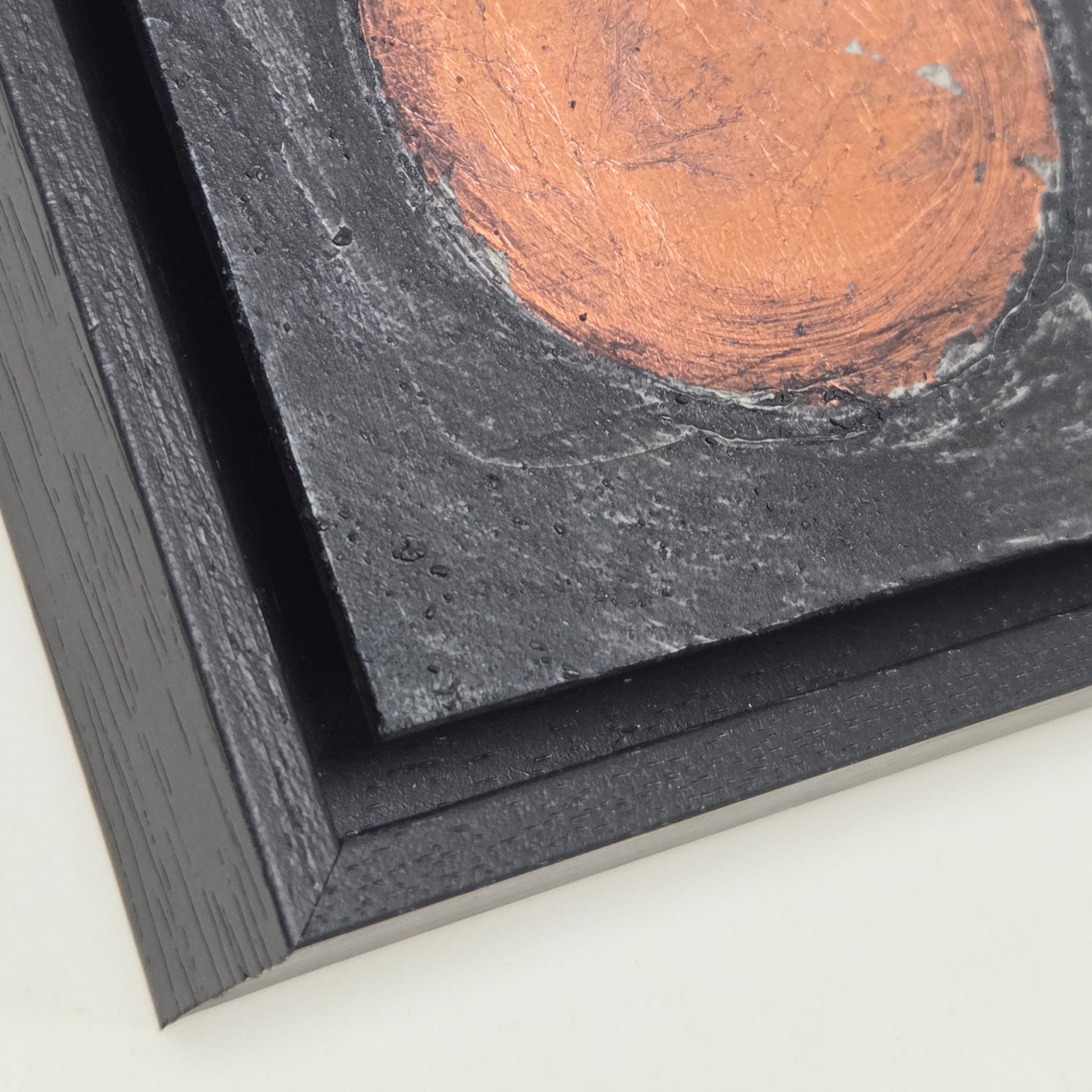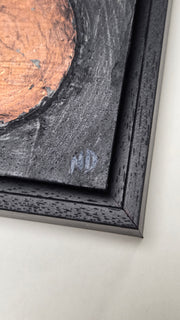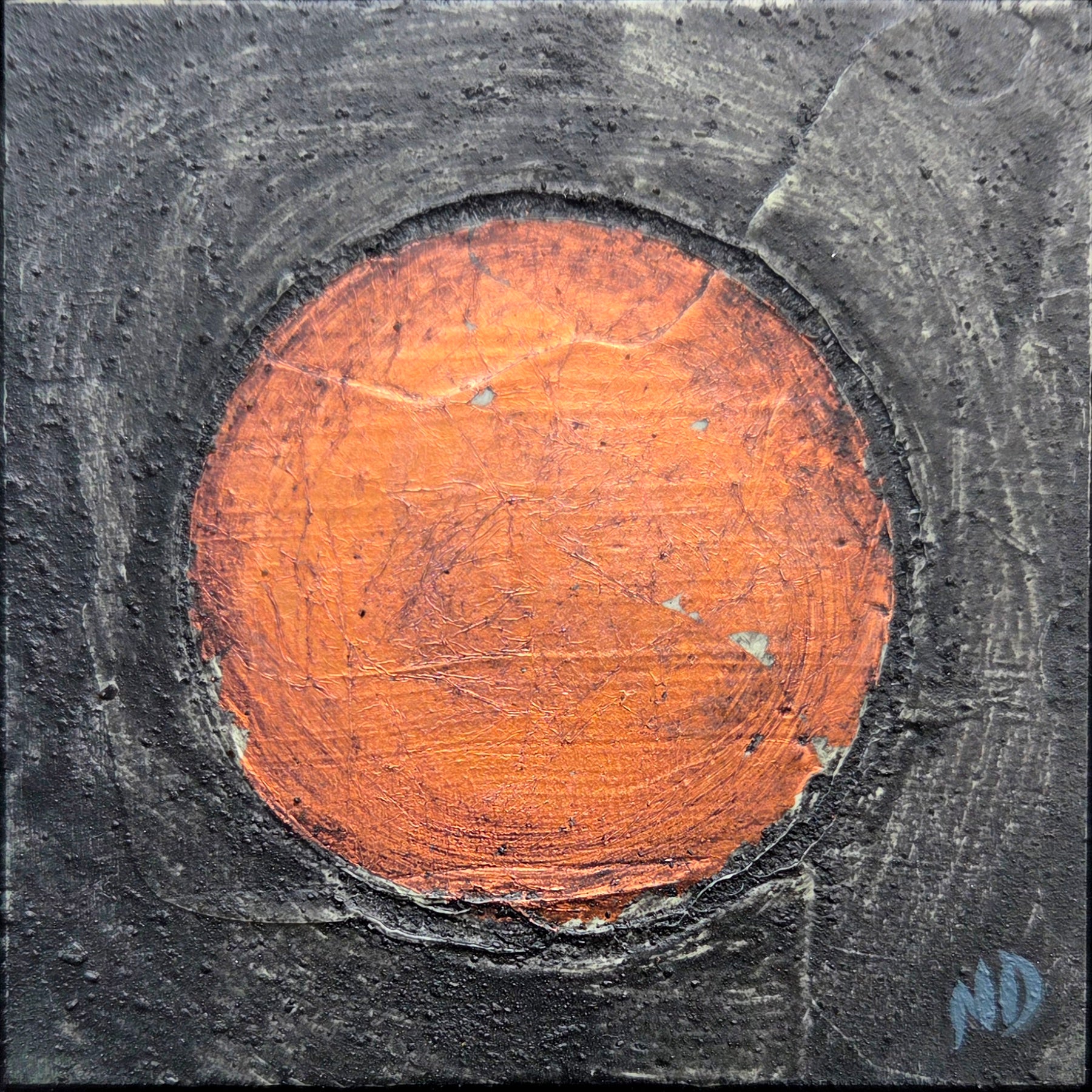 A bold, luminous orb of copper emerges from a field of deep, textured earth pigments. The central circle glows with radiant energy, suggesting a rising sun, celestial body, or ancient coin. This study celebrates the alchemy of materials and the timeless allure of elemental forms - a striking focal point in an intimate scale.