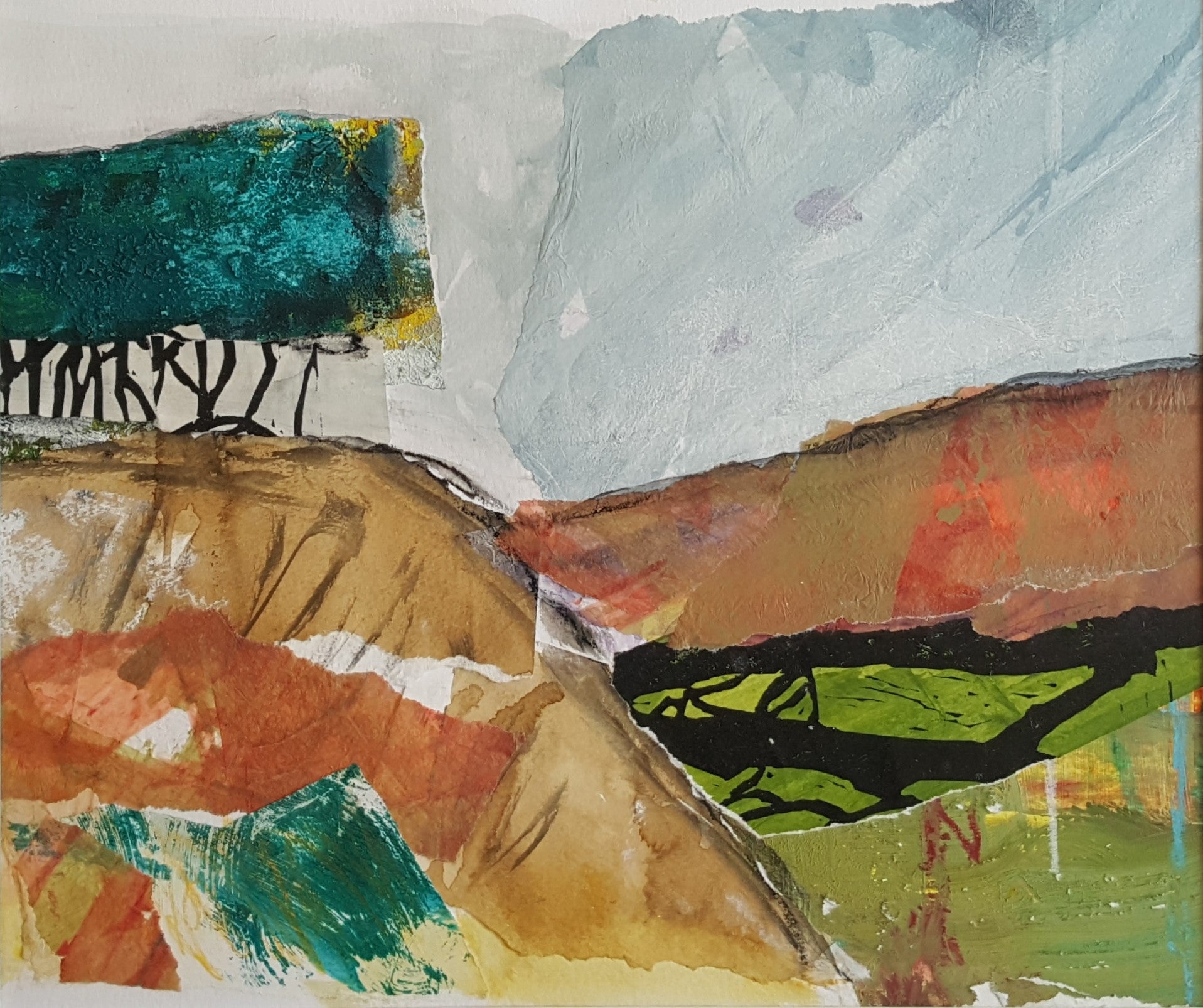 'Trees on the hill' is an original mixed media piece, incorporating collage, charcoal and paint on paper.