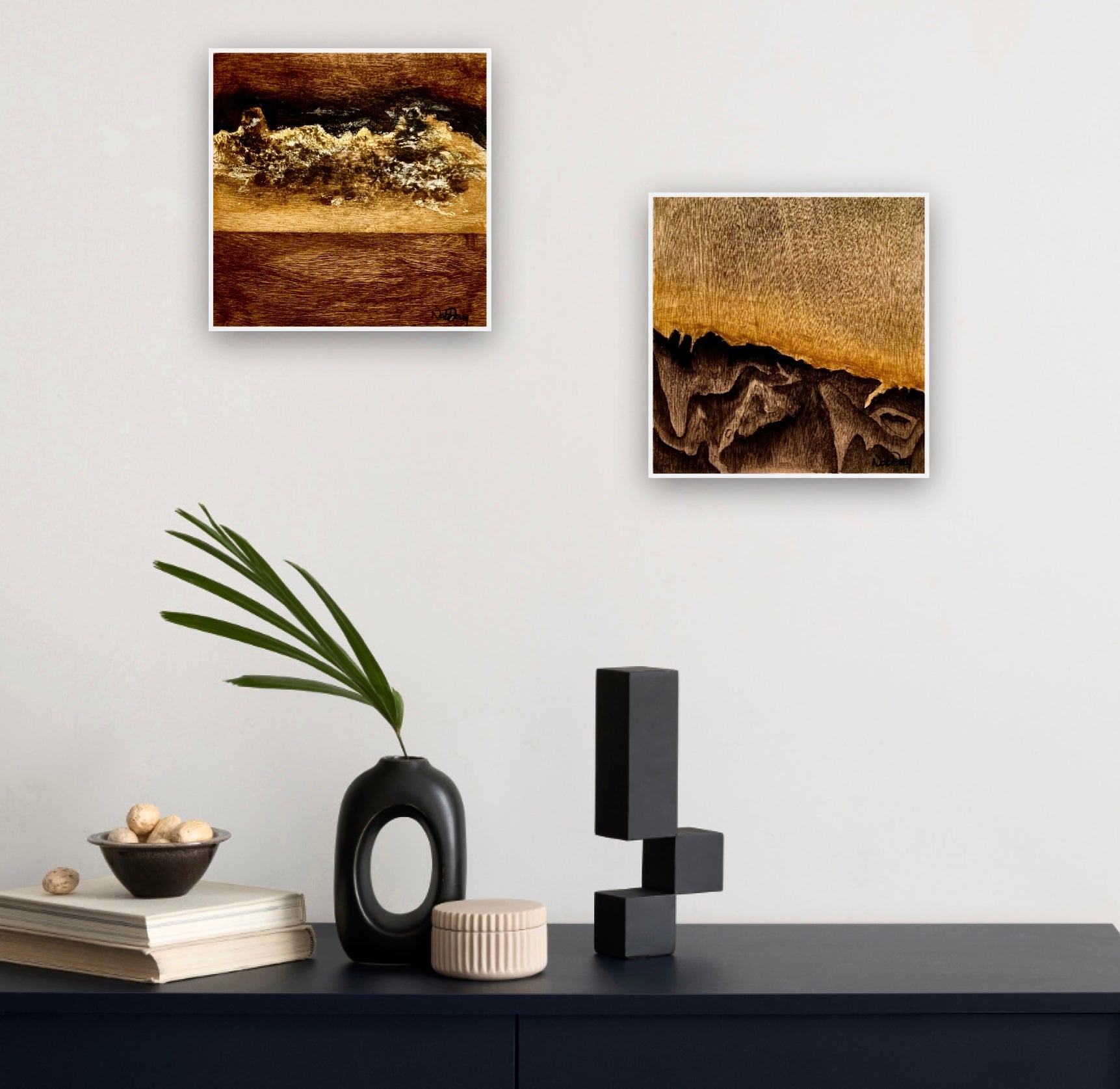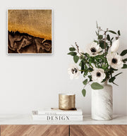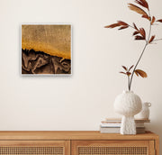 'Ancient Light' is where golden skies meet weathered shores, capturing dramatic silhouettes of this ancient land. Created with earth pigments gathered locally and taking inspiration from maps and topography of the area.