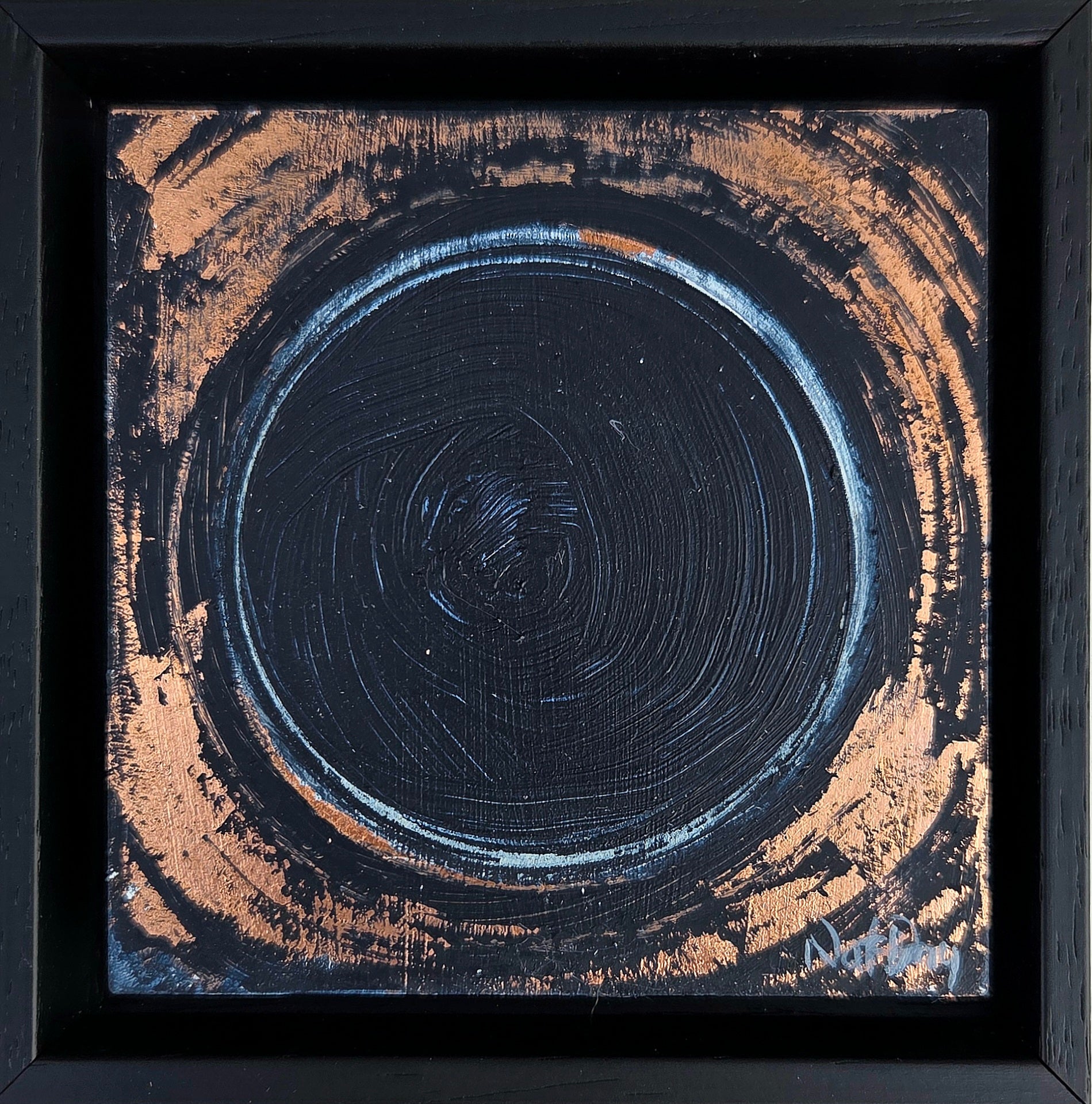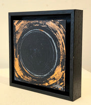 Concentric circles radiate outward like ripples on still water, creating a powerful mandala of copper and shadow. This study captures the essence of sacred geometry, where copper leaf fragments emerge from deep blue-black depths like ancient symbols waiting to be deciphered. The circular form speaks to wholeness and completion, whilst the weathered surface suggests the passage of time and the endurance of sacred knowledge. An intimate treasure that rewards quiet observation with its subtle complexities.