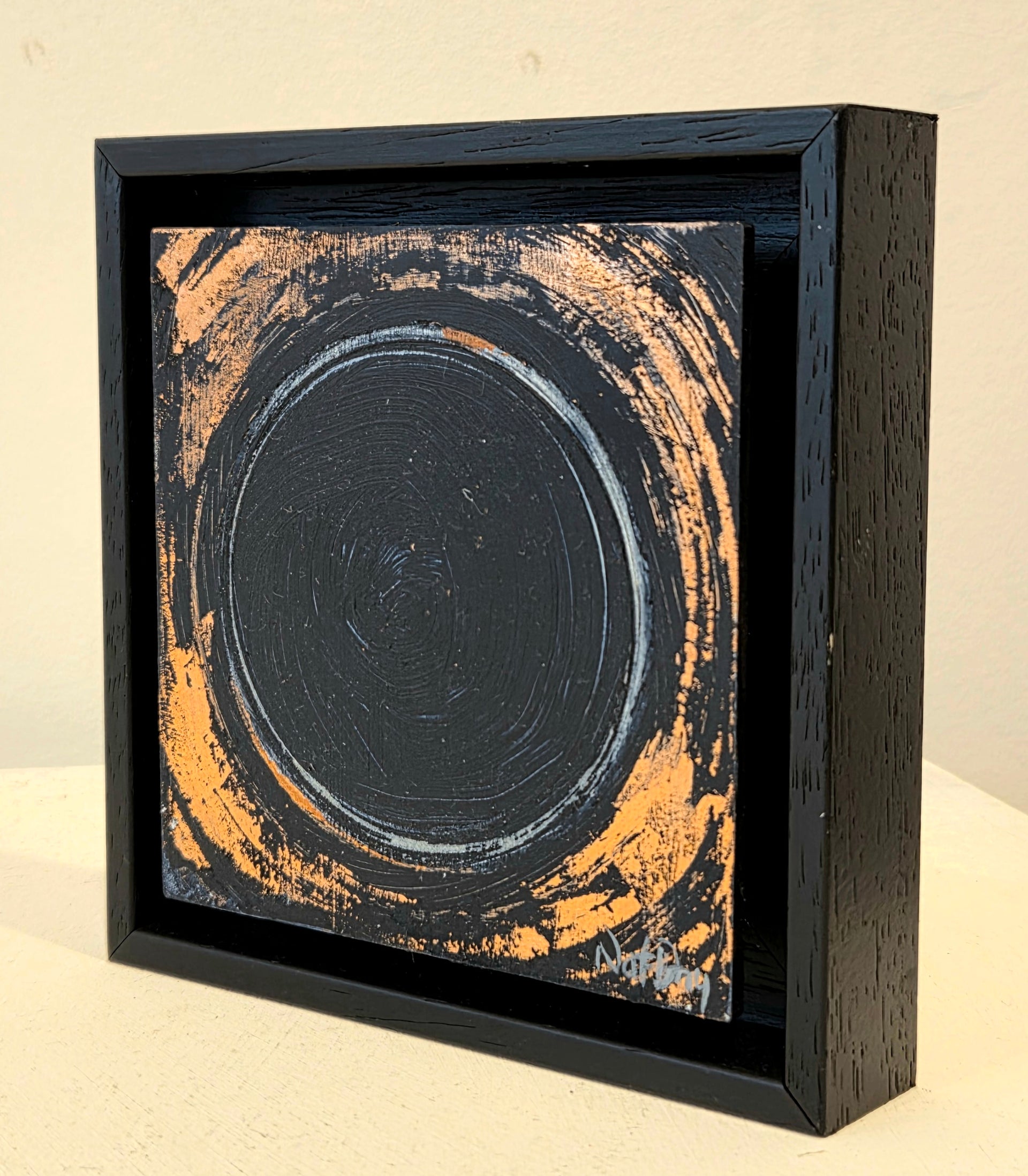 The painting is 10cm by 10cm and is supplied in a black float frame with fixings for wall hanging.