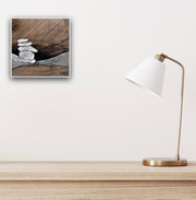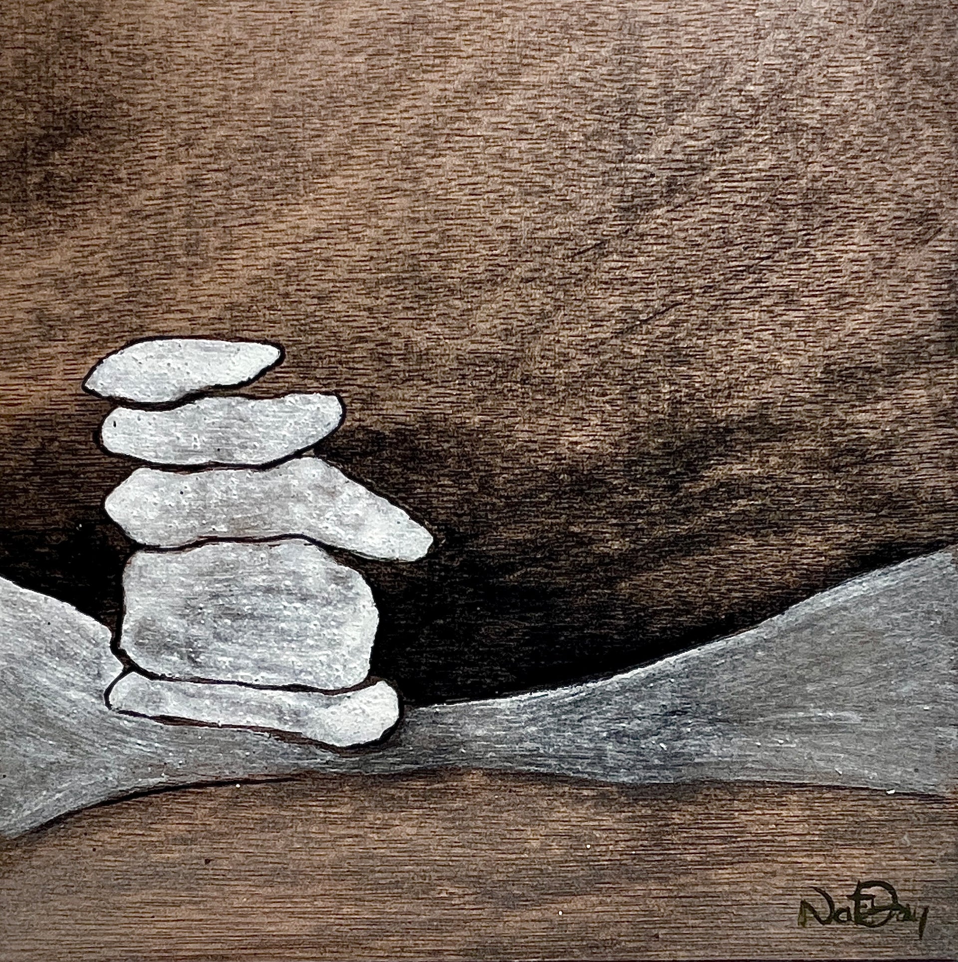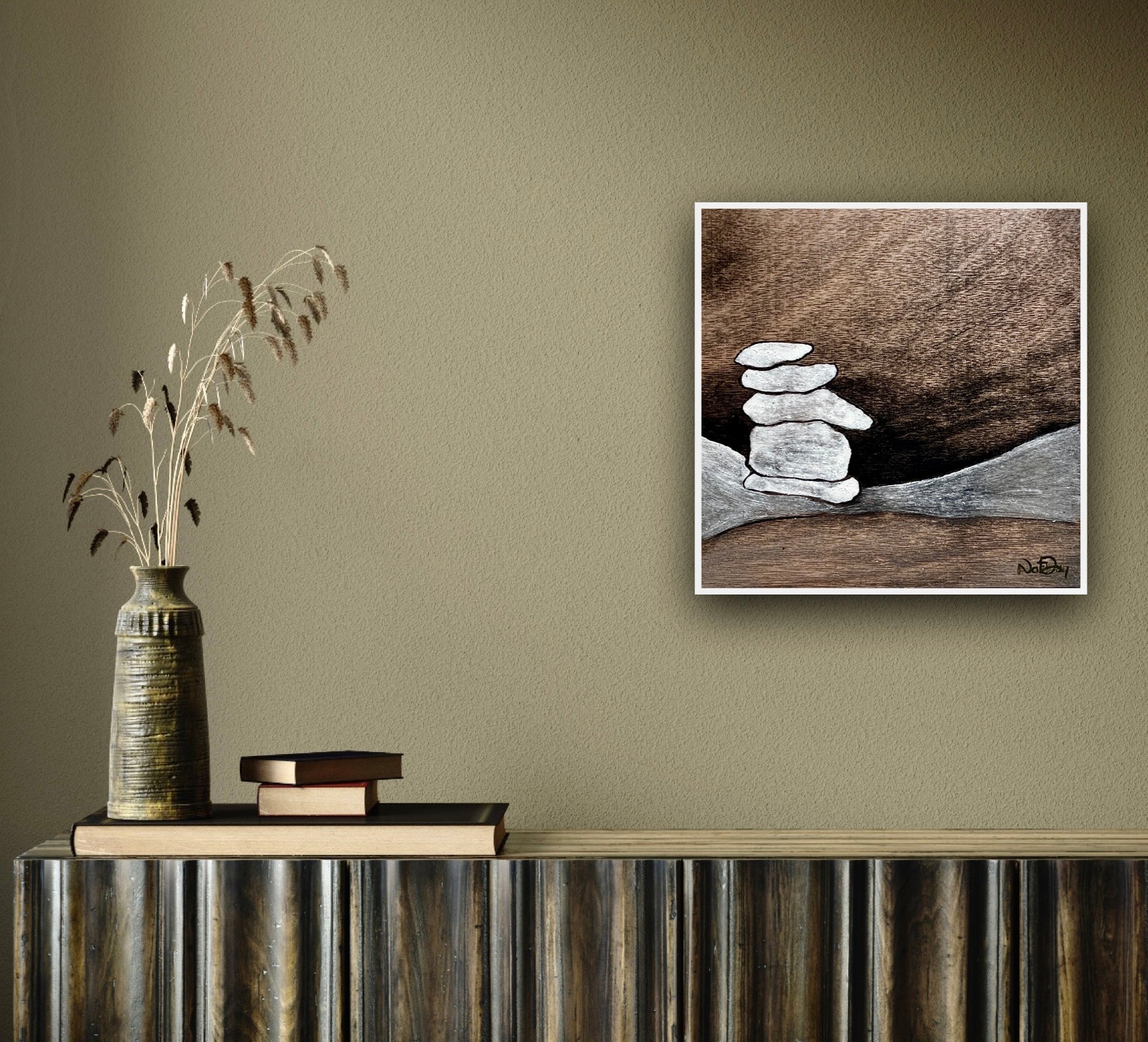 'Moorland Marker', a solitary stone stack standing against the moorland sky and marking a landscape travelled since prehistoric times. Created with earth pigments that echo the granite's weathered surface, this intimate study captures the dialogue between the elements and natural landscape.